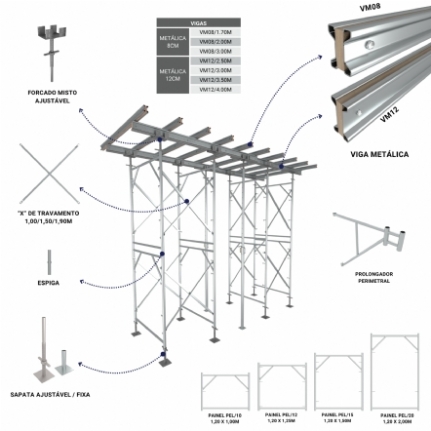 O escoramento metálico (cimbramento) é um sistema de estruturas provisórias composto por painéis metálicos, contraventamentos, escoras metálicas pontuais, vigas metálicas primárias (longarinas), vigas metálicas secundárias (barrotes) e seus acessórios, utilizado para dar suporte as formas de lajes e vigas durante a fase de cura do concreto.